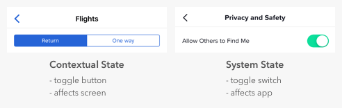 トグルスイッチとトグルボタンをデザイナーは混同しがちです。両方とも状態を管理しますが、トグルスイッチとトグルボタンには根本的な違いがあります。トグルスイッチはシステムの状態を管理し、トグルボタンは文脈上の状態を管理します。文脈上の状態のトグルはユーザーが見ようとしている現在の画面にのみ影響を及ぼしますが、システムの状態のトグルはアプリ全体に影響を及ぼします。