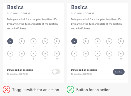 このアプリではトグルスイッチをダウンロード用のボタンに使っています。ダウンロードは持続的な状態ではなく1回だけの行動なので、これはスイッチの誤った使い方です。スイッチを切り替えるとコンテンツがダウンロードされますが、そのあとに終了します。スイッチをオフにしてもダウンロードを止めるわけではないので、ユーザーに誤解を与えます。