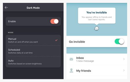 一般的にアプリの設定画面にスイッチが使われています。そこでユーザーがシステムの状態を管理するからです。しかしスイッチをアプリに影響のあるモードのトグルにも使えます。下の画像はプライバシーモードとダークモードの例です。