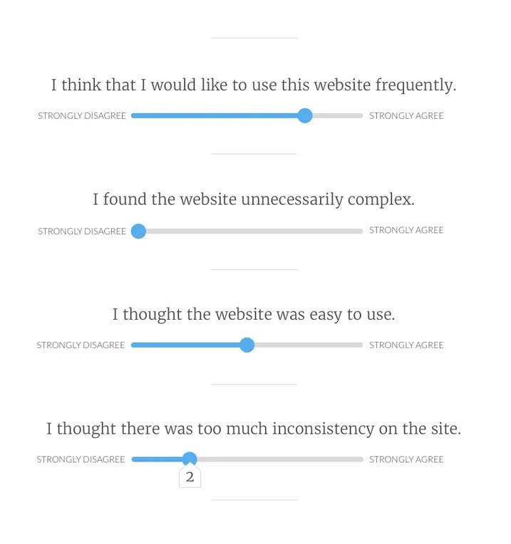 システムユーザビリティスケールは、ユーザーに一連の質問に同意するかを問う単純なアンケートです。回答者はそれぞれの設問に同意する度合いを1点から5点で順位付けします。5は完全に同意することを意味し、1はまったく同意しないことを意味します。