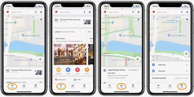 - 次に、画面の下部分から「隠された世界」へと案内する機能です。下にあるバーを上にスワイプすると、周辺のスポット、車、公共交通機関タブが姿を現します。もういちど上にスワイプすると、さらに機能が表示されます。下の画像例を見てください。周辺のスポットを上にスワイプすると、周辺にあるサービス(レストラン、ガソリンスタンド、お店など)が一目で探せるのがわかります。とてもわくわくすると同時に、役に立つ機能です。