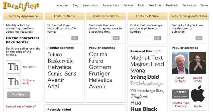 Identifontは今回のリストにある他のツールとは少し違った機能を持っています。あなたのフォントについて一連の質問をすることによってフォントを特定するのです。あなたの答えにマッチする上位3つのフォントを選び出し、類似したフォントも合わせて表示してくれます。
