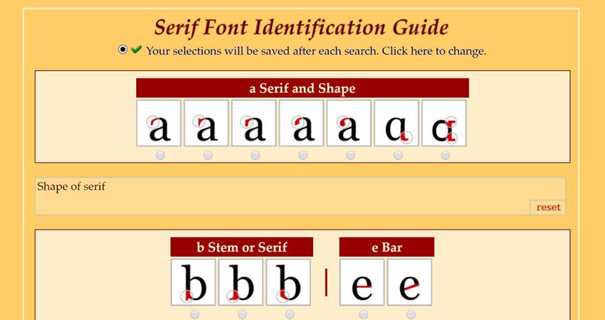 もし特定したいフォントがSerifに属するものであることが分かっているならば、このツールが役に立つでしょう。これはSerifフォントだけに特化したツールで、あなたはいくつかの質問に答えることで、どのSerifフォントが使われているのかを特定することができます。