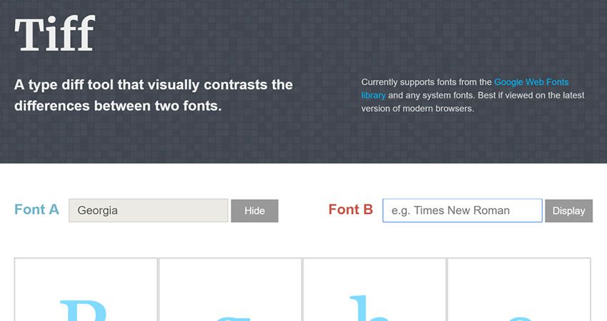 Tiffは、ユーザーがフォントの違いを明確にすることで、選択肢を絞り込むことができることを売りにしています。このツールを使って2つのフォントの違いを視覚的に強調することで、あなたは自分のプロジェクトに最適なフォントを選ぶことができます。