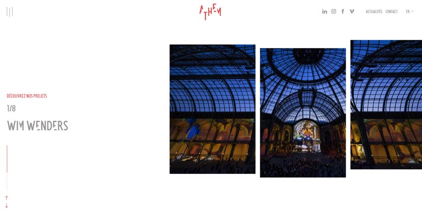Athemのチームはロゴを作り直すのではなく、ロゴの特徴を活かしています。画像が3つに分割されたスライダーをみてください。それぞれの部分がロゴと同じ配置になるように上下方向に動いています。