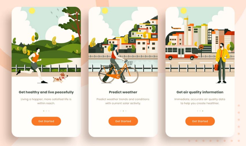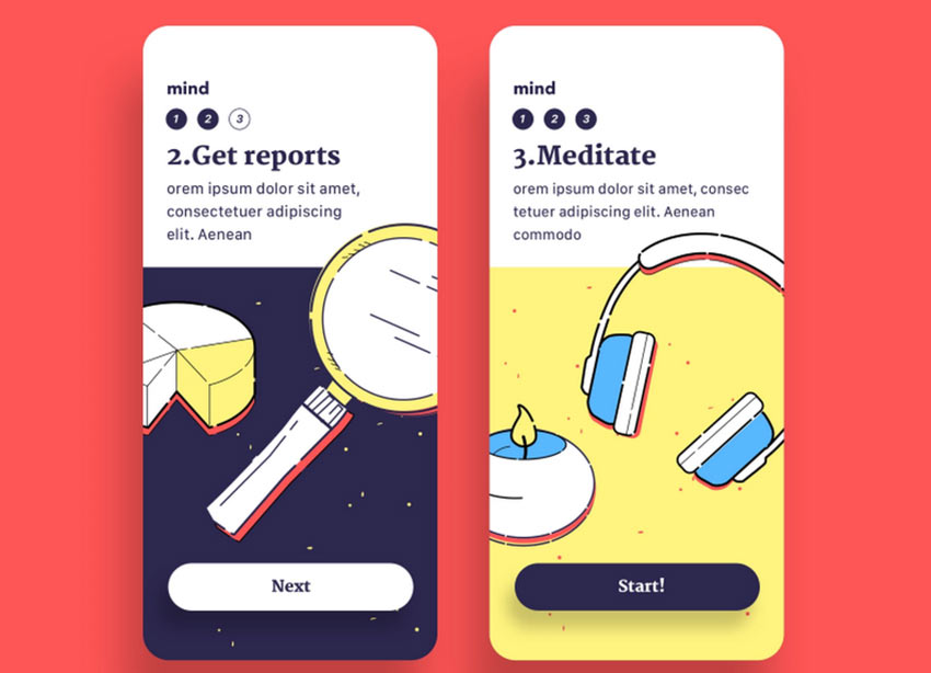 情報ボックスが完全な形でイラストされた画面と自然に調和していることに注目してください。これらは、スタンドアロンユニットであるだけでなく、写真に必要不可欠なエレメントです。オンボーディング全体は圧巻ともいえる、すばらしい作品になっています。