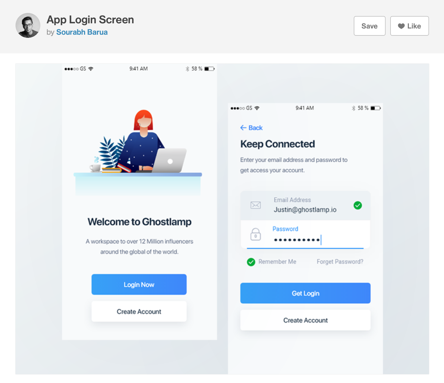 たとえば、Sourabh Barua氏がDribbbleに投稿した次のサインアップ、ログイン画面は美しいデザインです。しかし、この画面はUXのベストプラクティスを満たしていないため、本当に優れたデザインではありません。