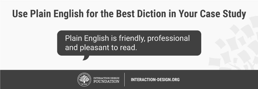 同様に、あなたの言葉遣いや文章のスタイルは、UXケーススタディを読む人に影響を与えます。効果的な文章の書き方をマスターしましょう。採用担当者にあなたのUXケーススタディを高く評価してもらうために、わかりやすい英語を使い、専門用語を避け、フレンドリーでありながらプロフェッショナルな言葉のトーンを選択しましょう。