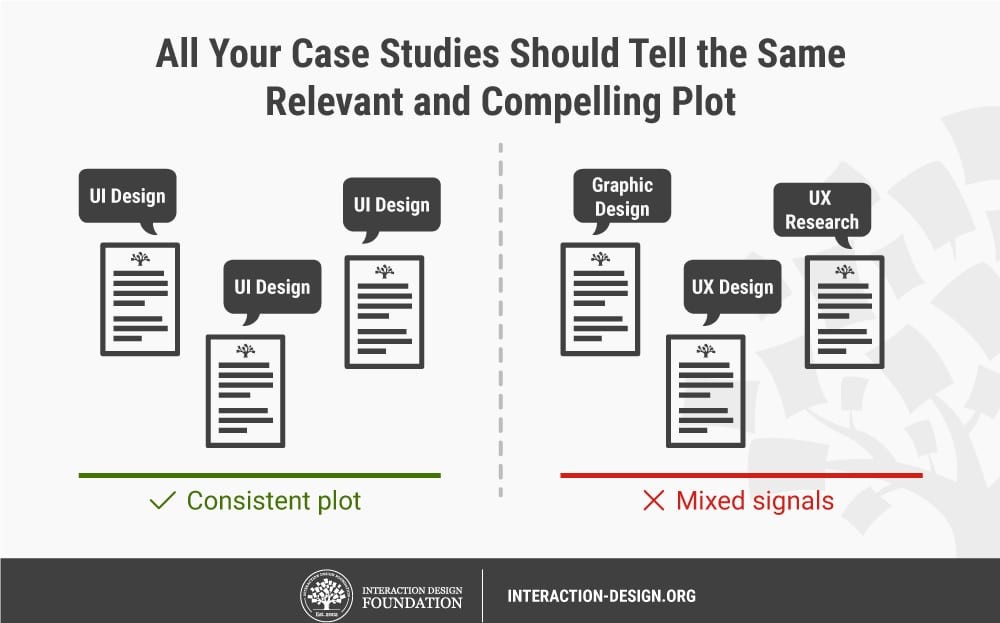 また、すべてのUXケーススタディを通して、プロットには共通性が必要です。これにより、ポートフォリオはまとまりのあるメッセージを伝えることができます。たとえば、UXリサーチャーを目指す場合には、すべてのケーススタディにUXに関するリサーチの経歴を含めるべきです。この共通性が欠けている場合、採用担当者に一貫性のないメッセージを届けることになり、あなたが希望するポジションでの仕事に適した人材かどうか判断が難しくなるのです。