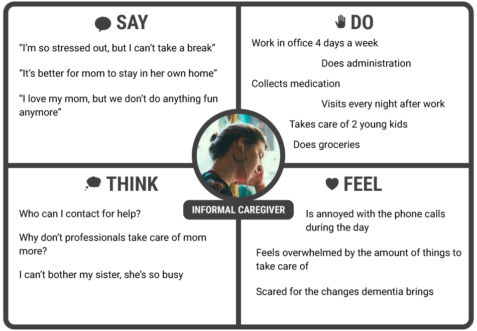 下の図は、認知症患者を介護する家族に対するユーザーリサーチの結果からつくられる共感マップの一例です。中央にユーザーのイメージを配置し、ユーザーへの共感を高めやすくしています。ここには、自分がつくったペルソナのイメージを使うことができます。