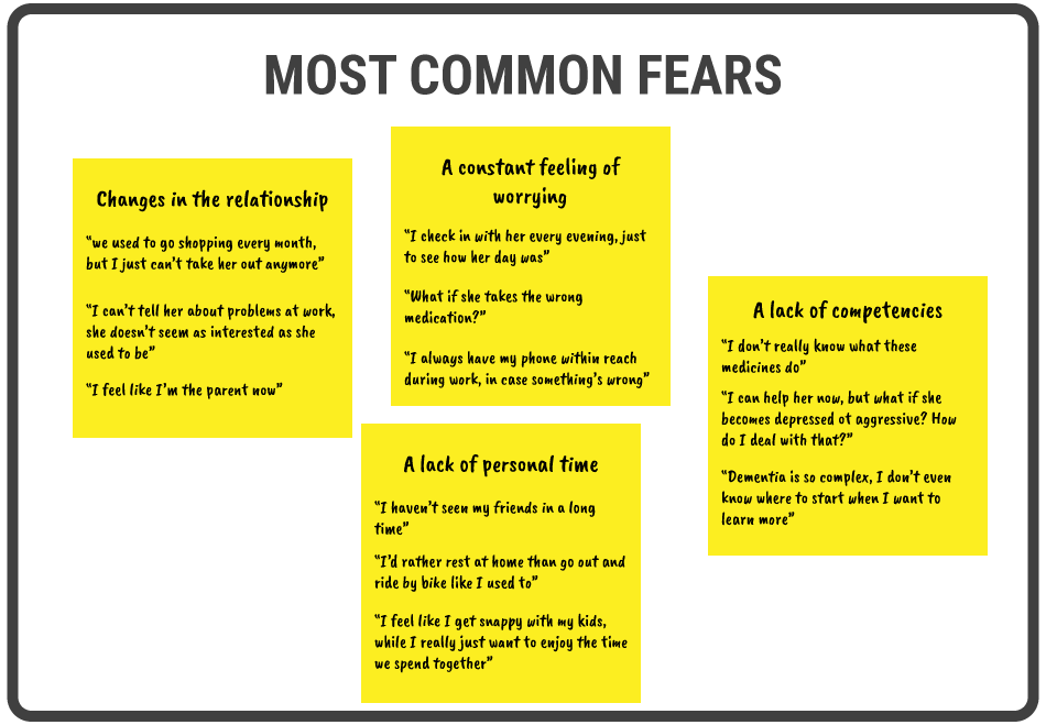 あなたはテーマ分析の手法を用い、多くのポストイットを使ってデータに意味を見出そうとしました。そして、新たなプロダクトをデザインする際に考慮すべき、4つの関連する不安のカテゴリがあることに気づきました。すなわち、関係が変化してしまうこと、つねに心配が絶えないこと、介護の能力への不安、自分の時間が無いことです。
