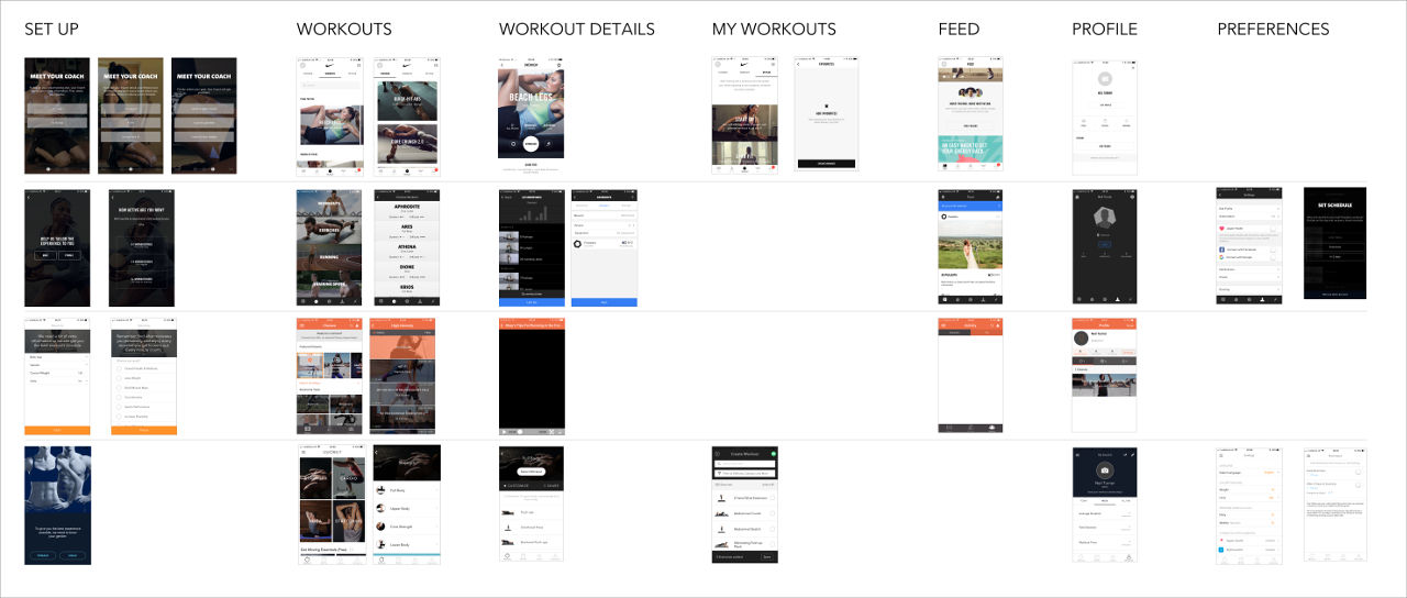 機能ごとに整理する優れた方法は、写真やスクリーンショットをユーザージャーニーの段階に合わせて図示することです。以下のモバイルフィットネスアプリの例を参照してください。プロダクトやサービスのユーザージャーニーを簡単に追うことができるように、それぞれの競合ごとに行を変えてください。