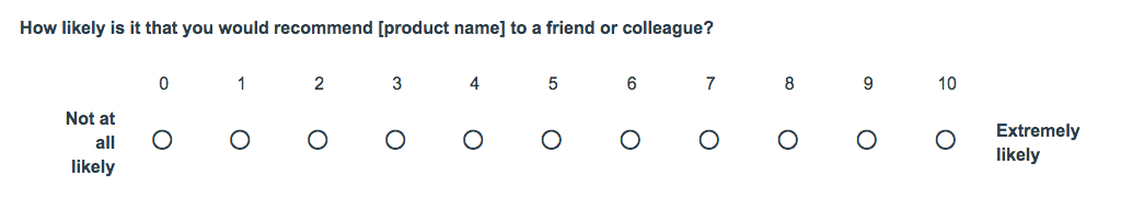 NPSは非常にシンプルな方法です。のちに述べますが、シンプル過ぎるとさえ言えるでしよう。次のような1つの質問をすることで、NPSを計算することができます。これにより、顧客がどれだけプロダクトやサービスに強い愛着をもっているかを知ることができます。