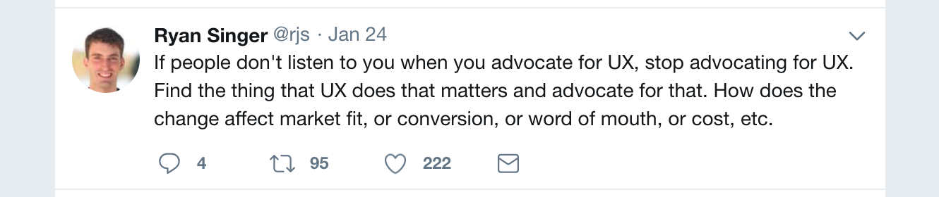 あなたがUXを提唱することで人が聞く耳をもたなくなるなら、UXを提唱するのをやめなさい。UXによって良くなったものを探し、それを提唱しなさい。その変化によってどうマーケットフィットが変わったか、どうコンバージョンが上がったか、どう口コミが広がったか、どうコストは下がったか、など…