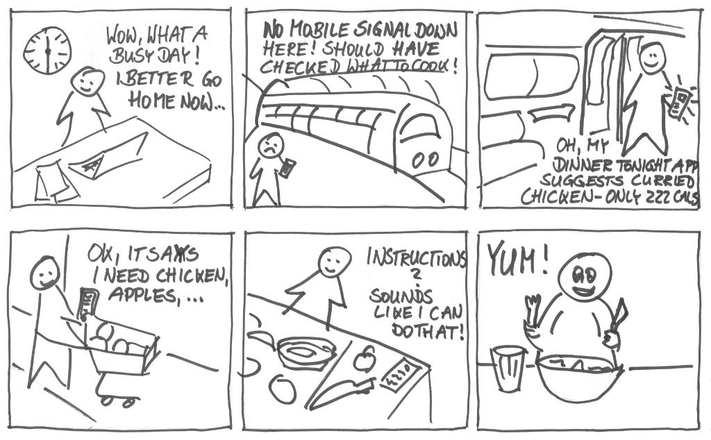 もっとも見込みがあるアイデアを選んだら、次はこれを実現に近づけるためにストーリーボードをつくります。ストーリーボードは、ユーザーがそのアイデアをどのように利用するかを説明した短編コミックのようなスタイルで作成します(下記参照)。これをイメージするために、次のストーリーボードの例を確認してください。