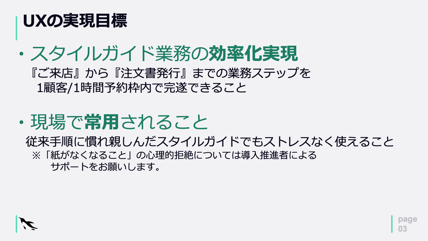 土屋:最初は先ほど見せてもらった伝票を1枚もらい、業務フローをまとめた100ページぐらいのドキュメントをもらったんです。そのドキュメントを見ると注文ができあがるまで100ステップぐらいあるんですが、そのうちスタイルガイドさんがやるのは、そもそも5ステップぐらいでした。