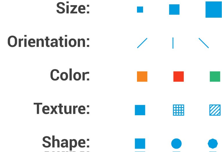 • サイズ:点、面、ボリュームのサイズであり、重要性や重みの情報を伝えます。