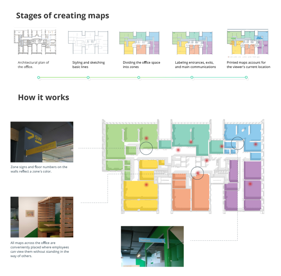 - 地図:それぞれのフロアには、全てのゾーンと部屋、行き先への向きを示した大きな地図を壁に貼りました。当初、これはよくある北を上にした単なる1つの地図に過ぎませんでした。しかし一連のユーザビリティテストを経て、この地図で示された向きが多くの従業員を混乱させてしまっていて、意味がわからずに、その地図を使ってなにかを見つけることをあきらめているということが明らかになったのです。そこで、最終的に私たちはそれぞれのゾーンに応じて、4つのバージョンの壁地図を各フロアに貼りました。