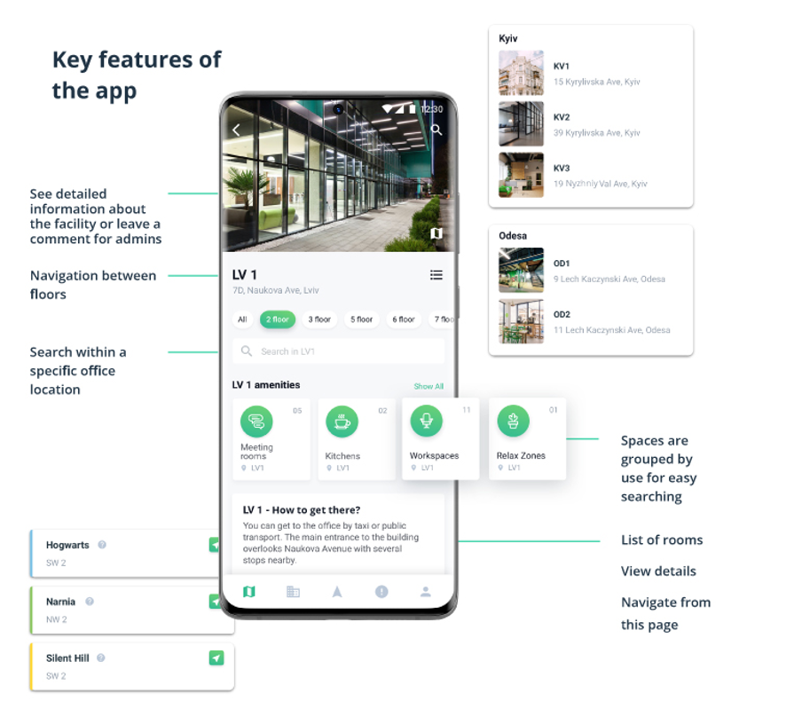 - ゾーン:私たちはオフィスをゾーンに分けて、それぞれに世界の地名を付けました。従業員がわかりやすいように、各ゾーンには特定の色を割り当てました。便宜上、キッチンとバスルームには同じ色を当てました。ここでつくった色のシステムが、私たちのマップにも使われます。