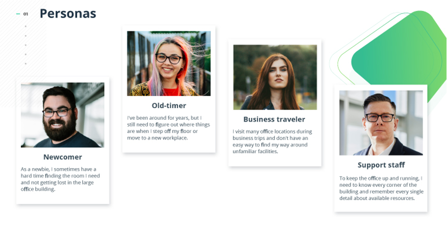 たとえば、会議室の場合を考えてみましょう。従業員が会議室を探すのは、純粋な好奇心からではありません。まず間違いなく、そこで会議をするためであり、あるいはブレストを実施する必要があるからでしょう。ですから、目的の部屋の正確な場所だけでなく、その部屋が空いているのか、必要な設備がすべてあるのか、十分に大きいのか、というようなことも従業員は知りたいのです。これらのことをすべて考慮しなければなりません。だからこそ私たちは、開発段階に進む前にユーザーリサーチを行なったのです。リサーチの結果、私たちは「新人」「ベテラン」「出張者」「サポートスタッフ」という4つのペルソナを特定しました。ユーザーを知らなければ、使えるプロダクトをつくることは干し草の山から針を見つけることよりも難しいでしょう。