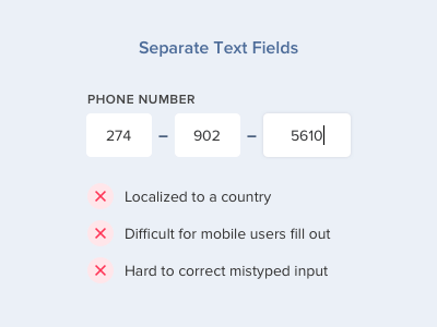 電話番号入力フォームは、生年月日入力フォームと並んでくせ者です。たくさんのフォーマットがあり、どの入力方法が正しいかを見分けにくいことがよくあります。国番号を入力すべきか否かさえよくわかりません。 適切な入力フォーマットを判別できないと、ユーザーは電話番号入力フォーム以外の項目も入力内容が不適切なのではと不安になります。電話番号入力フォームでエラーがでると、フォーム入力自体を放棄してしまうかもしれ……