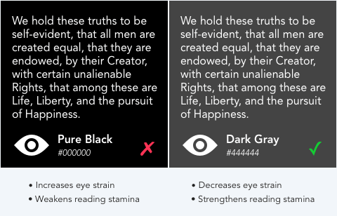 デザインにピュアブラックを使うと可読性が低くなると知っていましたか? 統計によると、「アメリカの成人の58%」がコンピュータ作業で眼精疲労を経験したことがあるそうです。デザイナーは使用する黒の色に注意を払うことで、目が疲れる可能性をある程度減らすことができます。 ピュアブラックの文字や背景 ピュアブラックの文字や背景と白の組み合わせは、ユーザーが文章を長時間読むとき目に不快感を与えることがあり、眼……
